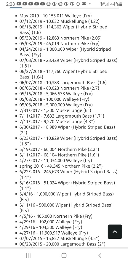 Did not see tigers in your list. The Tiger program in Iowa got busy in 1978. When the state found those fish had little success the money went elsewhere, including the urban trout program. Incidentally, same dates and same story with the grass carp program. Except those fish have been wildly successful to the detriment of our lakes. Other than the naturally reproducing fish maybe found in the IGL or inland rivers like the Des Moines, I doubt there is one tiger muskie remaining alive in the state.