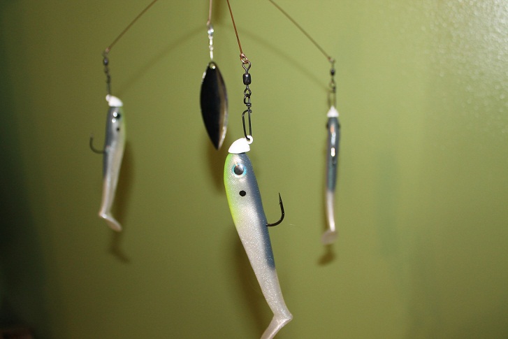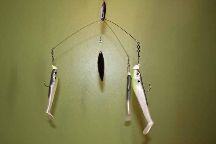 Luck-E-Strike Umbrella Rig with J-Will Heads and 5" Yum Money Minnows.This rig has heavier wire than the Manns brand...maybe .045-.050 wire. #7 willowleaf blade in center-25.00 shipped