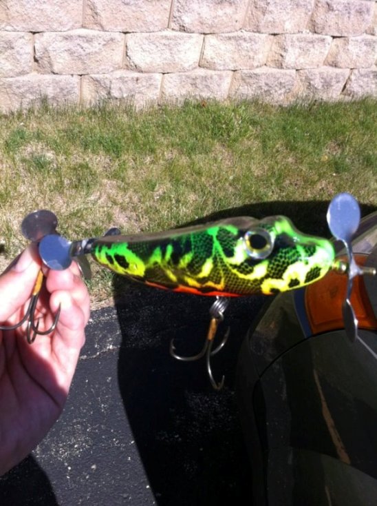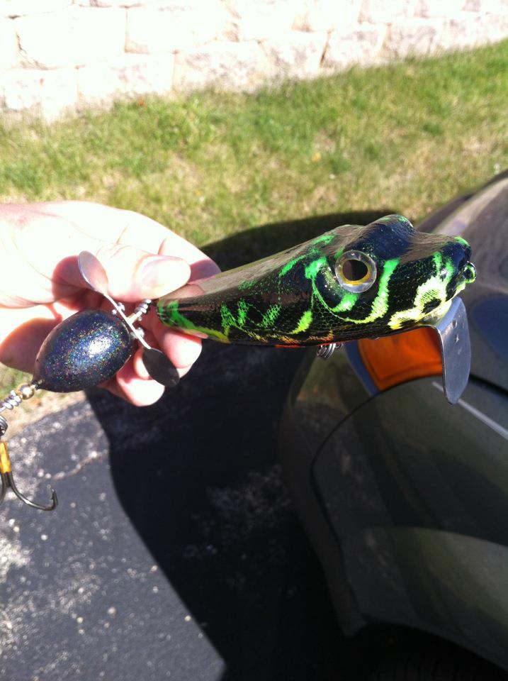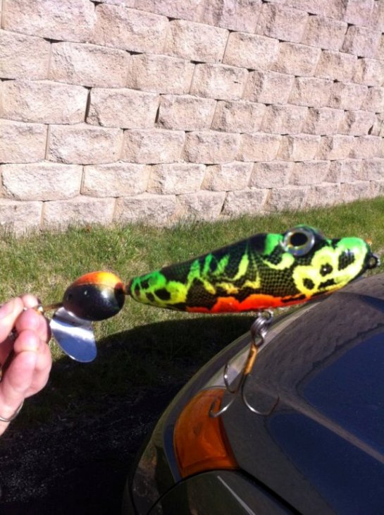 Posts: 39 Location: NE Twin Cities Metro | With that contrast and color scheme, I think most musky guys would get in touch with their feminine side and throw it. If it catches the fishes eye and puts em in the net, i'd put a bra and panties on a lure! Love the look of that lure, very unique which is great on todays pressured waters | ||