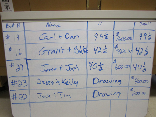 Posts: 225 Location: Nordeast Minneapolis | dmack and I were fortunate enough to find the winning fish... Not sure how this year's results compare with previous years, but here are a couple of photos Chris Munchow emailed me of the results. HUGE thanks to Mike's Bait on 8 for hosting a great tournament... I suspect a good chunk of it will end up back at Mike's. Water temps were mid 70's pretty much all day. Our action came in the first hour and a half, and the last hour and a half... all in about 4' of water. No shortage of pontoons or jetski's, but everyone we encountered kept a respectable distance. The tournament was my second time fishing Forest Lake (had to get in a practice fish after Dan entered us) and Dan's first, but I suspect we'll be around a lot more! Attachments ---------------- leaderboard_small.jpg (103KB - 186 downloads) 1stplace-1600$-3_small.jpg (95KB - 187 downloads) muskyrod-bigfish-49.5_small (94KB - 178 downloads) 2012 MUSKY TERNY 006_small.jpg (93KB - 202 downloads) 1stplace-1600$_small.jpg (86KB - 180 downloads) muskyrod-bigfish-49.5_small (94KB - 183 downloads) winning fish.jpg (148KB - 188 downloads) | ||