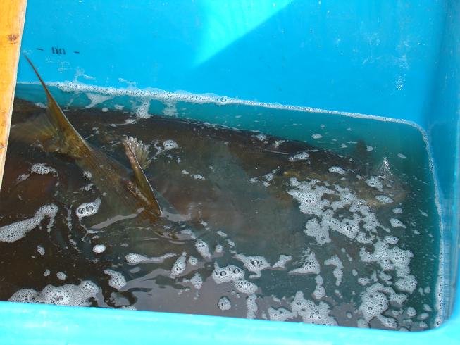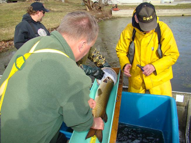 To capture adult muskies, biologists set large fish traps at nine locations from March 20 through March 26. They caught 143 muskies, including 69 female muskies.