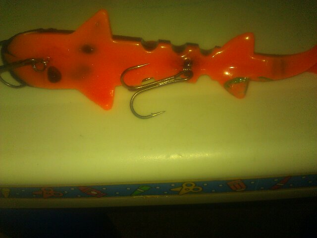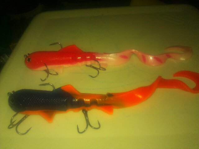 tackle industries mega d's I beleieve. Not sure. They measure inches 15 inches long. Orange one has little bleeding that went into bait from other bait. See pic. Both in good shape andd have some wear. No tears. $5 each