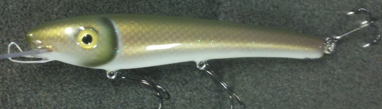 Location: Right behind you (tap, tap) BOOO | I bought a 5.5" shad bait off him over the winter, the bait is amazing, sweet paint job and great action. I picked it up on the large online auction site that rhymes with elay, they can sure get expensive near the end of the auction. He was offering a 13" limited production over the winter and that one was real expensive. Great baits though. |
