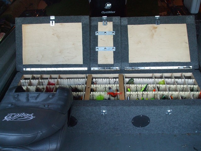 Posts: 84 | Its great not having to pack tackle boxes around and not trip over them. The outside of the box and lids (topside and bottom) were sealed, plus the carpet glue is actually a water tight barrier, so I'm actually double covered there. The inside hangers are simply made of luan. Super light and dries in an instant. Plus the vents keep the inside dry (there is also a hole in the inside bottom that goes over the floor drain in the boat). I made a portable tackle box 4 years ago with the same inserts and exposed treated cedar wood, and have never ever had an issue with mold or warping. I cut channels in the frame of the box so that the inserts would slide into and keep them in place. I was going to use lexan, but it is heavier, more difficult to cut, and the luan does not have any issues with rubber (petroleum based lures). | ||