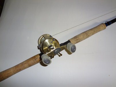 Calcutta 400 with power grips and braided 80# line SOLD bull dawg 8' extra heavy rod.In like new condition.$100 plus shipping