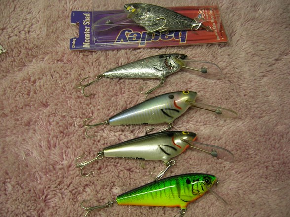 These are Florida made, not Dominican Republic. 4 appear unfished, one has light trolling marks as seen in pic. 4 have deep diving lips and 1 has the shallow casting lip. All five are $55 shipped to lower 48, check or Postal money order, 3 day return privelege minus postage. John NEW PRICE $50