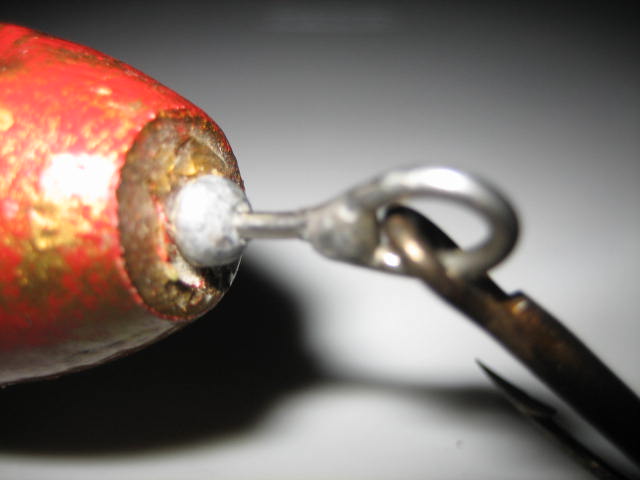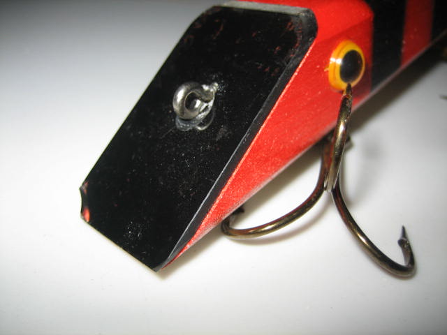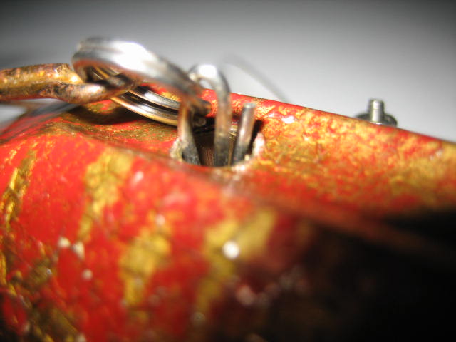 Posts: 152 Location: Nowhere near where I should be | I've included a couple close ups of the creeper the welded tie and hook hanger are very similar to an older le lure i have but nothing like the more common ones and it shares none of the shapes of the few i have. Could be a painters signature on the bait but im not sure,the paint job looks older and is bubbling a bit but not letting loose , thanks for looking. | ||
