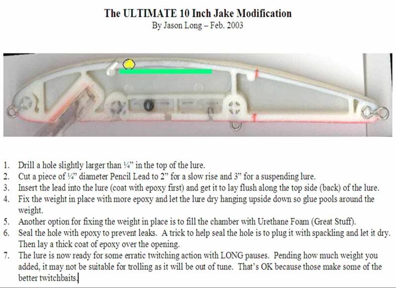 Posts: 1939 Location: Black Creek, WI | I've done a lot of tinkering with lures over the years, but this modification is one I still consistently use. Suspending Jakes are an incredible lure. I also reference this photo at times when wanting to kill the rattles. Two small holes in each rattle chamber... a squirt of super glue to "lock" the rattle.... and seal up the hole with epoxy. Quick and easy once you know where to drill. Attachments ---------------- JakeModification.jpg (64KB - 452 downloads) | ||