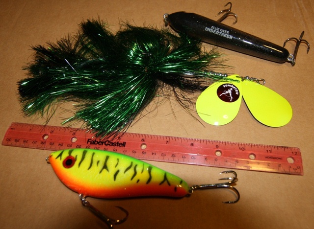 The Dominatrix double 10 spinner is new and still has tubing over the hook points; black & green with chartreuse spinners; have many other colors of Dominatrix. The 6 1/2 inch Blue River Undertaker and the 5 1/4 inch Ace Shad look unfished but are not in packages. The Undertaker is wooden with a gold scale pattern with a black back and white belly. The Ace Shad is plastic with internal rattles; firetiger. $9 each. Shipping will be $5 for one, or $6 for two or three. If interested send me a note and I'll email photos. Have more topwaters and gliders. My shoulders are done with double 10s and many gliders. Swithching to more cranks and double 8s. Kevin
