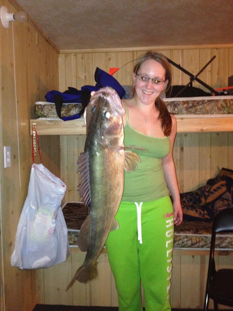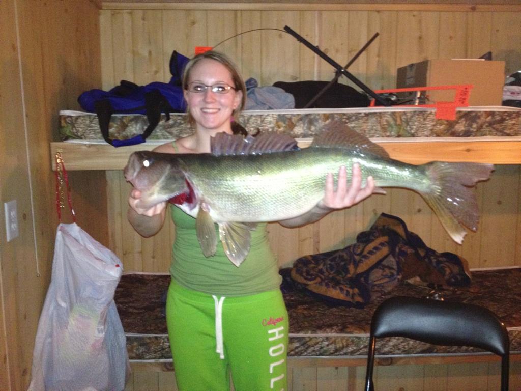 Here's the cool part of the story: so were sitting there and its about 515 pm, and if ya know LOTW, there isn't much of a night bite. So were playing cards n having a drink when I look over at my vexilar and are a large mark suspended 15' down over 30' of water. I grabbed my rod and brought the jig up to the mark and smack, I set and miss, I could feel that I lost my minnow so I tell her to grab her jig rod and drop it down as I'm keeping this "mark" interested with my bare jig. So as she drops her bait down I crank mine up. Couple twitches later and whack! 30.5" pig of a walleye.