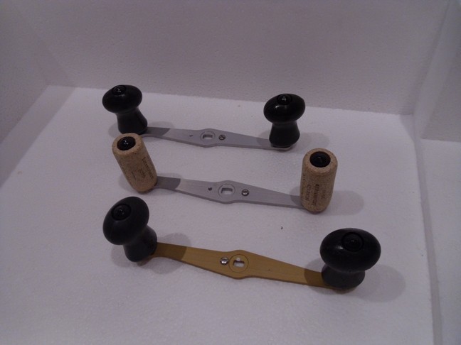 Location: Latitude 41.3016 Longitude 88.6160 | Here are the Specs on the Power Handles : * Made of 6061 anodized aluminum with stainless steel hardware. * Paddles are fairly large made from of Rubber Urethane, with a ergonomic shape, bigger then the stock paddles. *** Reel will not engage on the cast with a double paddle handle. This Power Handle is user friendly unlike a single power handle. *** * A full 5" from paddle to paddle provides more Torque and Leverage then a typical std. power handle. Most stock power handles are 4" long. This handle will make DCG 10-13 feel like a small bucktail. * Also come in a Wine Cork paddles, nice feel to them and are very light. *All handle include the locking plate screw. * Counter Bored to the oringinal handle thickness. | ||