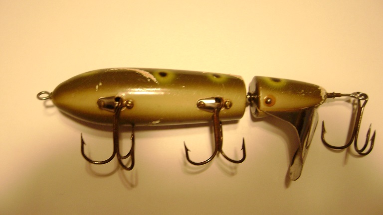 Passed by a rummage sale the other day and saw a heavy rod with an Abu Garcia on it propped against the garage. Thought I better check it out. Picked up this topwater and trying to figure out what it is. Made of wood, 7 1/4 inches long. Through wired with soldered loops. Has glass eyes and one single pin (not screw) epoxied in to hold the blade in the tail. Front two treble hooks are bent slightly at the eyelet to let the hooks lay back against the lure. Any ideas? Tried to search last night but came up empty.