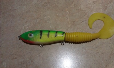 Posts: 566 Location: Elgin, IL | I would have to give the nod to an old Husky size black Hawg Wobbler I purchased used, a jillion years ago. Ironically big Bass and Pike love it too, it's f-an golden. The blades are so loose, and it's been repainted by me with model paint. Like Todd, I would have to say a 9" holoform silver Grandma is a close second. This bait has worked extremely well during a certain season. It's been shredded...I would like to get them coated like yours. | ||
