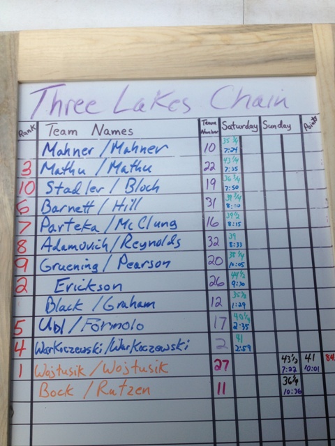 Location: SE Wisconsin | This is a great tournament. I've been fishing this event for the last 7 years and while the boat numbers aren't what they were three years ago or more, it's still a decent turn out and always a lot of fun. Good people, some great sticks and definitely one of the coolest water bodies in Wisconsin to chase skis. There were 32 boats this year, but there would have been more if teams didn't turn around and drive home. More boats means more payout... Plain and simple. The rain was great to fish in. It kept us cool and made for a great bite. We stuck a 32" shorty first thing in the morning just after a 43/44" fish came unglued that we had pulled hooks from the day before pre-fishing. Throughout the day we had a couple more swing and misses before sliding the bag under a solid fish to put us in the running. The following day of sunshine hindered our pattern greatly and we were back to square one again, but that didn't keep us from competing. We had two short nippers half-heartedly try to eat our baits, but no cigar. The Wojtusiks came out of the gate swinging and hit a home run. Those brothers are truly a couple of the finest sticks I know, and it came as no surprise to me when I saw the results at the end of day 2. Good job, Dan and Mike, excellent stickery. Attachments ---------------- IMG_0314.JPG (125KB - 244 downloads) | ||