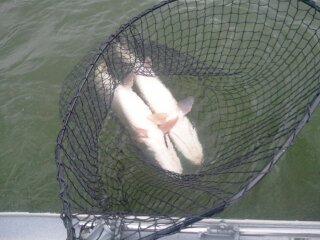 Location: 31 | IAJustin - 6/24/2013 1:40 PM Musky Brian - 6/24/2013 1:33 PM I would love to know if Frabill users have the same problem Not at all- I actually prefer the big kahuna solo...you cant move it as fast as some of the smaller nets but its harder to miss them Right on; I'd add that you always have your hands full netting alone with any net, kinda goes without saying... but it sure adds to the fun too. I agree 100% that the BK more than makes up for its bulk once you get use to it, but it does take some practice and a slightly different approach to lead the fish to the net though. I try to hold the bag and handle at the same time and move the fish into the net with the rod, then I strap the handle down so it stays level with the water to work on the fish. I didn't move the net much on the second fish here (couldn't), just dipped the rim and powered her in. It was pretty rough water that day and they momentarily flipped over from the wave action when I took this, the only picture... both released just fine. Attachments ---------------- Sept 2012.jpg (19KB - 148 downloads) | ||