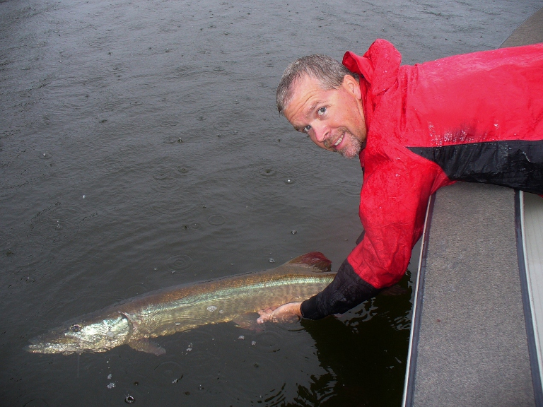 i was fishing on lake "x" of the woods last week and had my best friend with me for his first trip. had one of the most memorable and funny things happen. we were fishing a little bay in the pouring rain, so everything is kinda slick. casting a bucktail and a big fish shows behind it. i go into the figure eight and she almost eats, but then glides off. i grab a small twitch bait and about four casts later she comes back. into the figure eight she comes unglued and eats the bait. set the hook and a small run and then she comes completely out of the water. all of her body weight brings the line very tight and the rod gets jerked from my hands. all i can see is 400 dollars being pulled away. i go down to my belly on the gunnel and can only touch the rod with my fingertips. i react instantly and dive head first, rainsuit and all, into the lake. i get ahold of the rod and come up and my partner, steve, is already on the nose of the boat. i hand him the rod and he reels up and still has contact with the fish. i swim to the back of the boat, climb in and grab the net. steve then fights the fish and in the net she goes!! we both kinda collapsed in laughter about what just took place. she turned out to be the biggest of the trip at 47". even if it had been 37" it would still be a great memory for the two of us. the whole trip turned out awesome with twenty fish in the net. anyone have one to top that? lets hear them. Todd