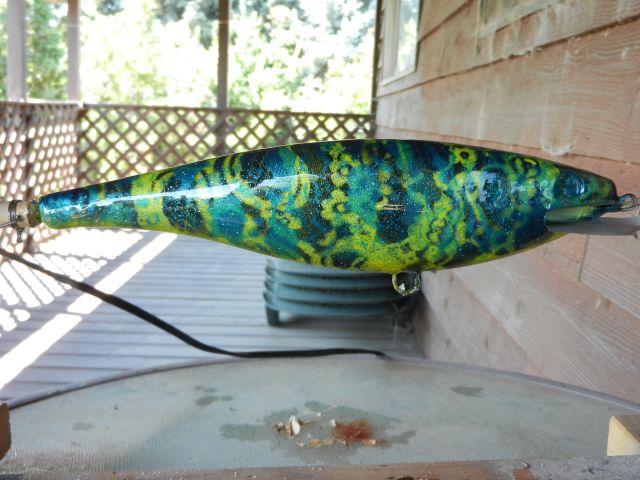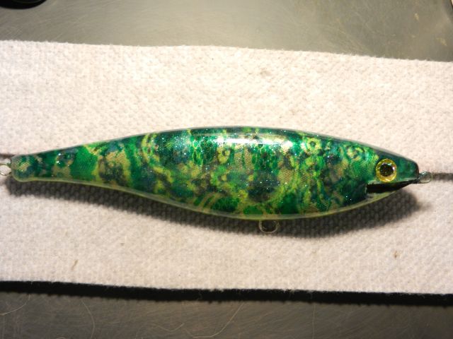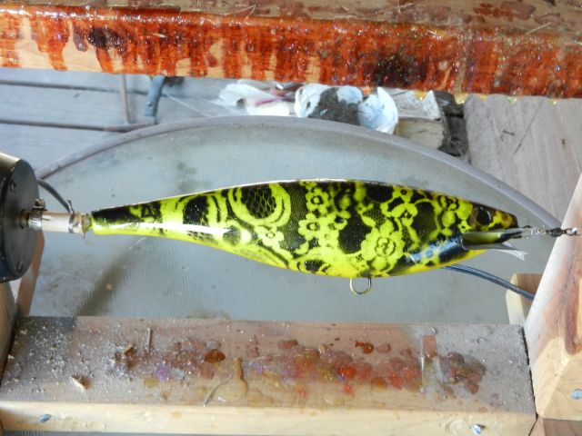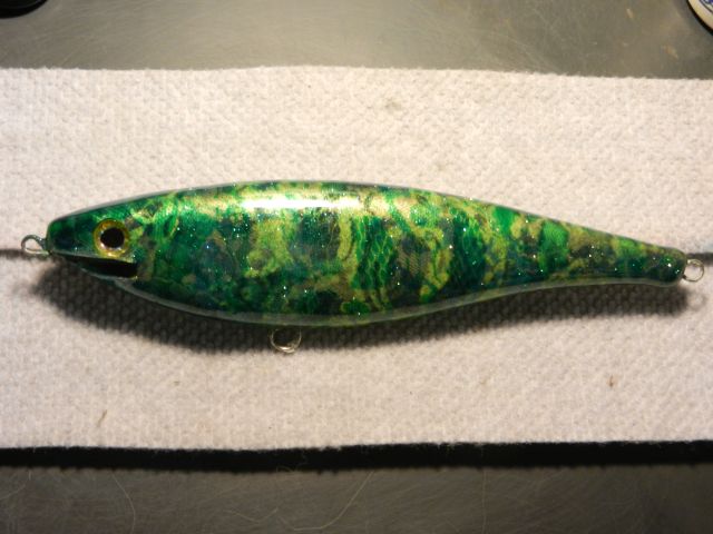 An all paint lure that evolved from (1) chartreuse/black, (2) blue, (3) gold, and finally (4) green. Three lace patterns were used that each covered roughly 1/3 the length of the lure. The patterns were rotated as each color was added.