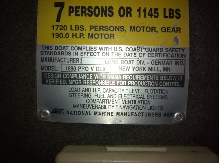 My Triton did not have a tag. Someone forgot to put it in. Just got done getting it taken care of from the manufacturer. I now have a new tag at no cost. I would contact Lund and get the correct tag. They should replace it at no cost. It might take awhile but if it were my boat I would have the correct tag on it. The Coast guard is running around up here, maybe there not on your lake but the longer you wait for a new tag the harder it gets. Just got done with mine and I started in June. Good Luck.