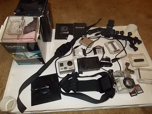 Go Pro Hero 2 outdoors edition with lots of extras, wifi backpack, 3 batteries, 110/12v battery charger all USB cords 8 and 32GB Class 10 SD cards... $250