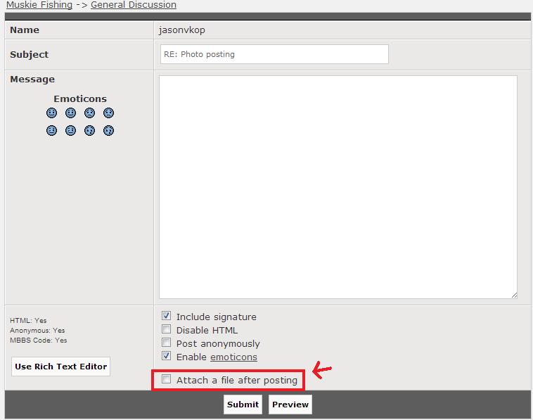 Posts: 618 Location: Michigan | After writing a post there is a box at the bottom of the page labeled 'attach a photo after posting'. Simply click that then hit submit; it will then take you to another page where you simply upload your picture from your computer. Attachments ---------------- Untitled.jpg (37KB - 189 downloads) | ||