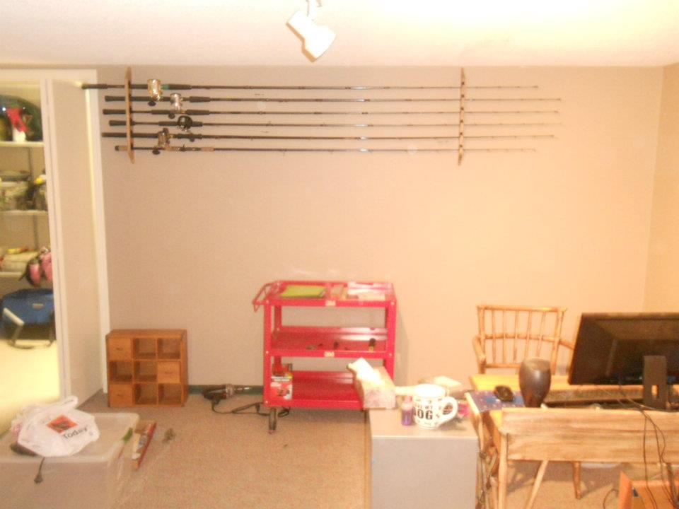 Posts: 756 | Horizontal Wall mounted rod Holders. Cabellas has nice wood ones. They ook like this. I actually have 2 more of these now under the second pic.... so i have a ridiculous "Wall O' Musky Rods"..I took these pics a couple years back when I moved into my current residenmce.. Attachments ---------------- 420245_2927909030852_856833352_n.jpg (58KB - 166 downloads) 427666_2927910990901_1749879734_n.jpg (55KB - 196 downloads) | ||