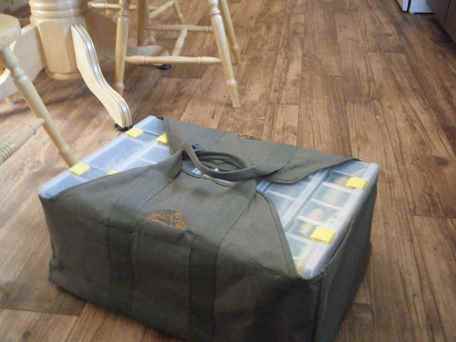 This week Home Hardware has a heavy canvas log carrier on sale $14.99. This will perfectly hold 6 deep and 1 shallow 3700 style boxes or any combination you like stronger than anything I've seen in a tackle shop. I have used these for years for bringing in firewood but just bought one for lugging lures to and from the boat.