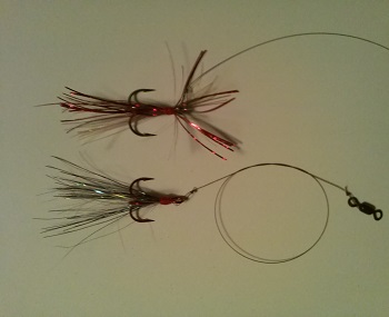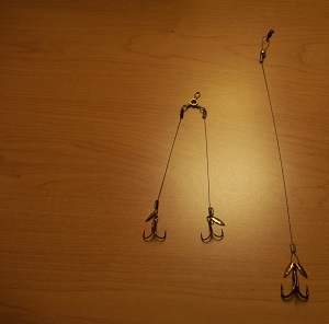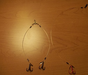 I have a line of tip-up rigs I've been making since I was a young fellow. I prefer a single rig when possible and hook up just as well as doubles. As far as I know, now in mn you can use plain treble as long as it doesn't exceed 9 inches but still prefer to add the blades. I am waiting to hear back from the MN DNR on some other rig styles too to clarify what is good and what is not.
