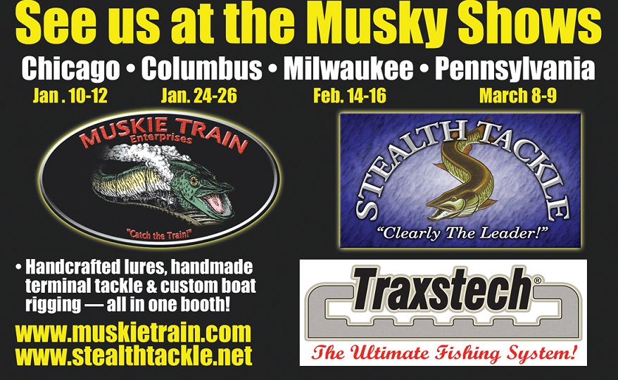 Posts: 2037 Location: lansing, il | Stealth Tackle will be teaming up with Muskie Train and Traxstech this year. We have expanded our supplies for guys who like to make their own leaders and also added cannonball weights in various sizes to our line up of the usual variety of Fluoro and Wire leaders that cover just about any need. Muskie Train will have his line of fully handcrafted lures that he makes himself from start to finish. We will be displaying and selling Traxstech systems for your boat as well. Stop by and check us out. Helping us out at Chicago next weekend will be Green Bay Guide, Captain Kevin Pischke and Captain Terry from Rampage Sport Charters of Lake St Clair. Both will be on hand to talk fishing and book trips if needed. Edited by muskihntr 1/5/2014 5:25 PM Attachments ---------------- Tri-Ad (2).jpg (240KB - 234 downloads) | ||