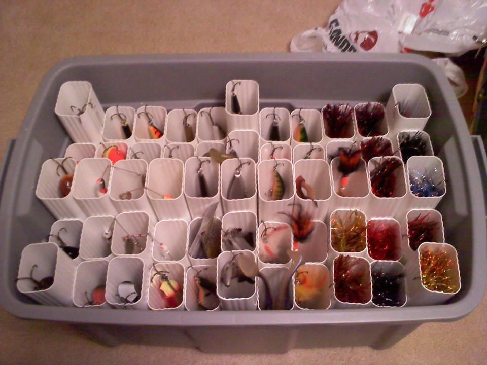 here you go, keeps moisture down cause there is extra air and who wants to wrap and un rap lures all the time, found a more square tote, got four 8' section of PVC down spout, chop saw took 4 minutes to cut them all, and i have 3, and they make it easy to transport store and with a lid makes them rain proof, total cost was about 40 bucks to have 55 holes in 1 tote, but i used 2x3, if your gunna do mostly dogs may be easyer if you use 3x3" downspout