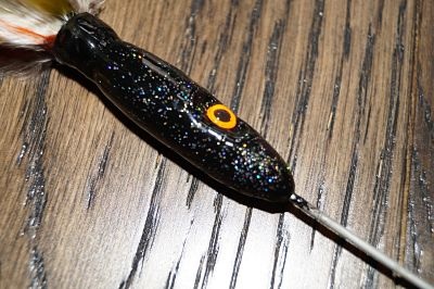 0.62 wire, single 8/0 hook, 7/0 trailer (not on in pics) 1.5oz slender head, powder painted black with clear gold and silver holo flake, devcon epoxy on wraps and heads, 3D eyes.