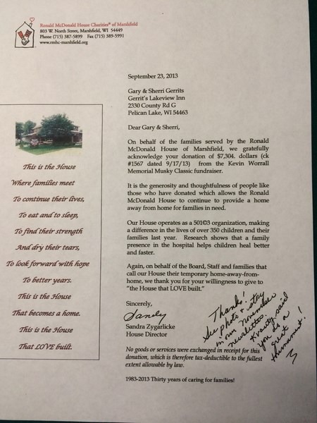 Posts: 290 | GERRITS LAKEVIEW - 3/25/2014 4:43 PM 23nd Annual Kevin Worrall Memorial Musky Classic will be held Sept 6th at Gerrits Lakeview!! We are in the process of contacting sponsors for the tournament. If any anyone is interested in donating or fishing in the tournament please IM us. All of the proceeds from this tournament go directly to the Ronald McDonald House. Last year we donated $7304.00 to them!! Great job to our sponsors and musky fishermen!! Another Thank you goes out to Muskie Metal Lures for donating to the Tournament!!! Edited by GERRITS LAKEVIEW 3/28/2014 4:59 PM | ||
