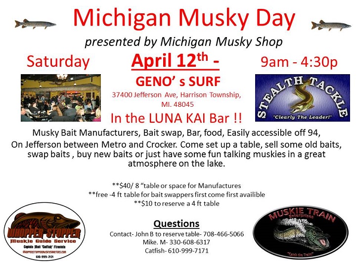 | Just to let you guys know The Annual Michigan Musky Shop Open House on April 12th has been moved to a new venue on the lake Genos Surf in Harrison Township to provide more room for a much larger event. It is now called The Michigan Musky Day. See the attached flyer.