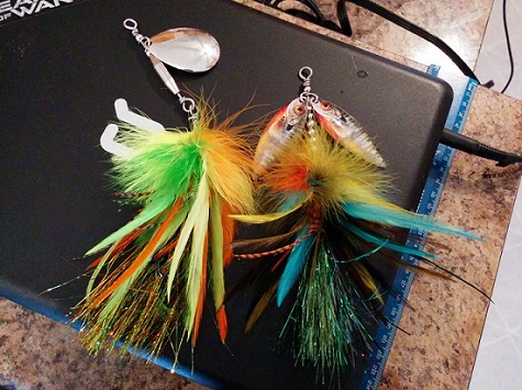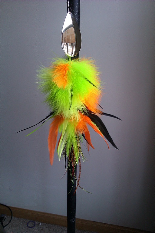 Posts: 410 Location: Waconia,MN | Here is a different style of bucktail I made, probably been done before but I've never seen it. They start out fat up front and tapper off towards the end with a good amount of hackle and a nice amount of flash around the hook finished off with long skinny rooster saddle feathers that trail 4-7" behind the hook. wish I would've added more flash to the pink one, and the brown and whites isn't finished. the firetiger one is by far my favorite one that I have made so far weighs over 5oz and is just over 19" long and equipped with a mag #12 blade, can't wait to throw this beast of a bucktail just don't know where im going to put it. Attachments ---------------- black pink.jpg (99KB - 210 downloads) IMAG0359.jpg (78KB - 188 downloads) firetiger.jpg (97KB - 201 downloads) firetiger2.jpg (79KB - 208 downloads) | ||