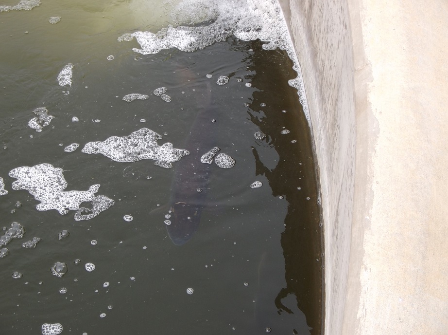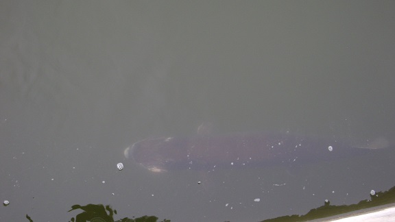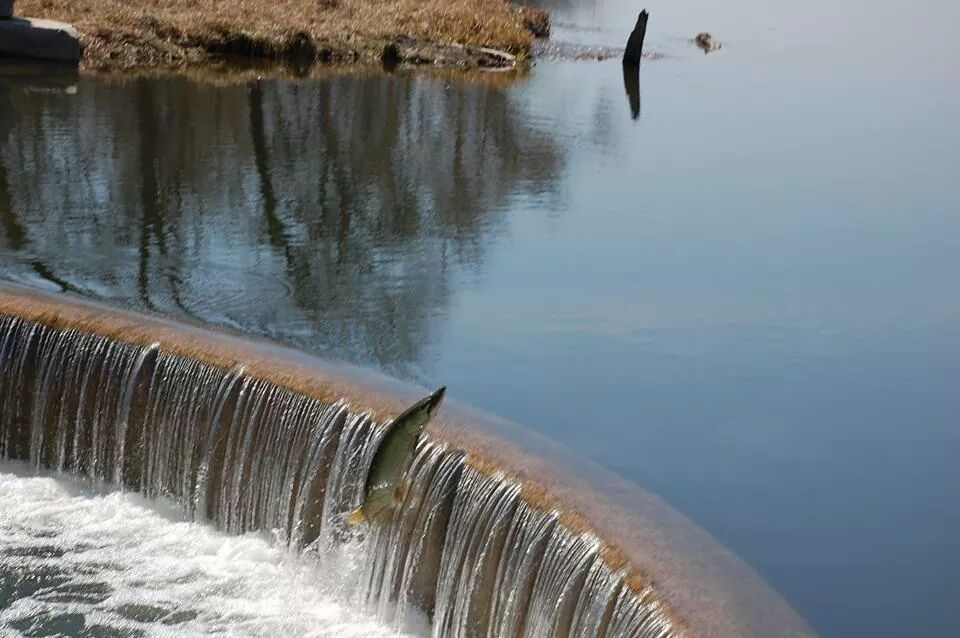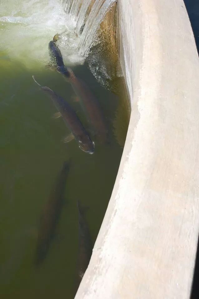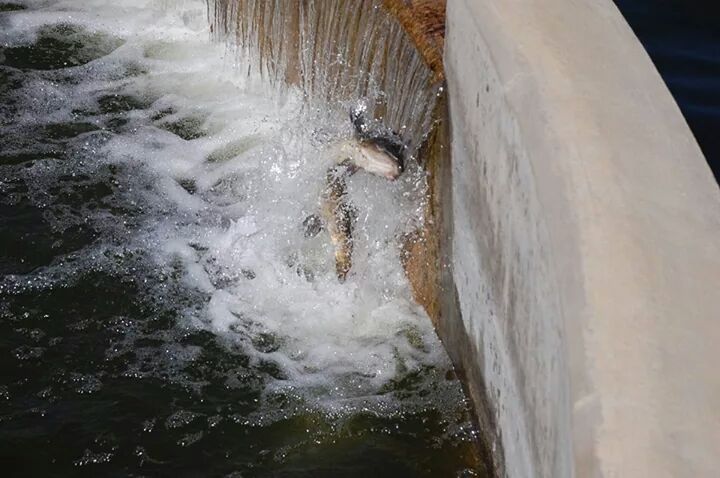| The weather was drizzling today at 5pm. I watched a 40" fish nose around the left end of the Wingra Creek dam, wait for five minutes, and then stand up at least 20" out of the water, trying to get over the dam in the middle of it. It thrashed like that standing up out of the water, trying to jump up the dam for about 5 seconds and then gave up to rest some more. |