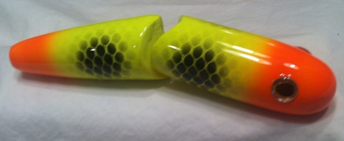 Posts: 791 Location: WI | Auto clear is basically the same as many factory finishes. A lot of newer baits use water based clear but the durability is about the same. If you T your hooks it holds up ok. But it's not like epoxy. The client understood that and was more concerned with retaining the action. He had had one done with heavy epoxy and said the action was not the same. | ||