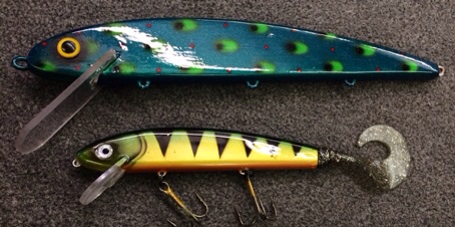 Posts: 791 Location: WI | This has been a really cool project. These are 14" wooden Grandmas. Made by hand by Jake Satonica in the early years of Grandma lures. They appear to be some sort of pine with a copper through wire. Some might think of it as sacrilege to paint such a rare bait but the owner has a few more an likes to use these baits. He sent them to me with a fair amount of flaking paint but as you can see the wood beneath was in great shape. The baits were stripped and resealed. Then painted the patterns requested by the client. Called by the website blue frog and zit frog. Then as requested I used three coats of auto clear instead of epoxy for fear of throwing off the action. The original eyes were epoxied back on and off to MN for some fall trolling. The last pic is to show a comparison of a twisted granny which is based on a classic 7.5" grandma. Edited by Trophyseeker50 9/10/2014 7:27 PM Attachments ---------------- image.jpg (55KB - 169 downloads) image.jpg (42KB - 152 downloads) image.jpg (63KB - 163 downloads) image.jpg (64KB - 165 downloads) image.jpg (52KB - 170 downloads) | ||