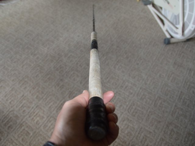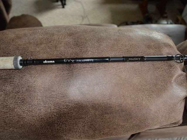 | 4) Okuma EVX Graphite Musky rod 7'6" 20-50 lb line 3/4 oz Lures. This rod is a couple years old it has been lightly used and has a weight taped to the but to balance the rod. Asking $40.00 PLUS SHIPPING