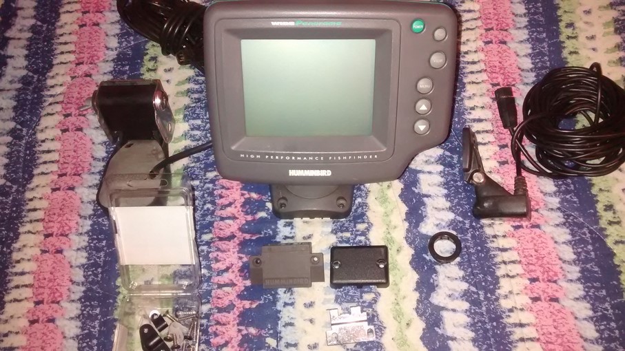 | I just found a old Humminbird Fish Finder that I removed from a small tin boat I bought a few years ago, I just checked it and it works Fine. The back had a crack in the Plastic and the original owner used a white Epoxy to seal it up..Does not interfere with the way this works at all, Not Pretty but it worked fine... Just needs a little Gray Paint.....This Is a complete unit with all hardware, screws, caps, cords, an 2 transducers one High Speed and one regular . Great for someone who wants a cheap working Fish Finder..........$45 shipped....