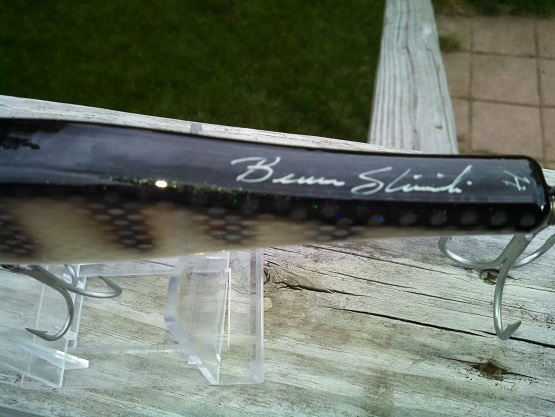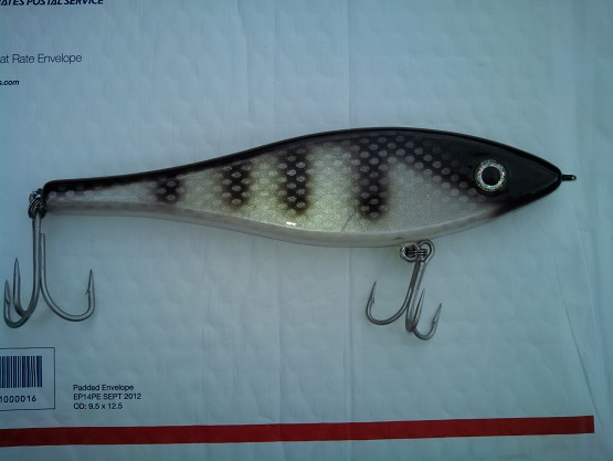 this is a slightly used BEAVER made and signed " PERKA " Glidebait. Very slight use with some front hook scuffs on the one side--Can see in picture--Signed by beaver. These are Super Well Built and finished baits---$20 shipped to you in the states