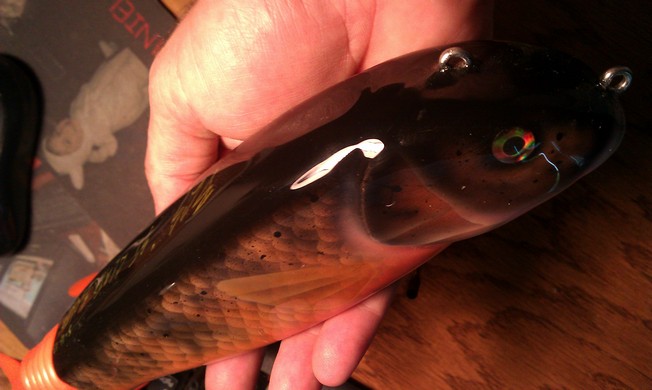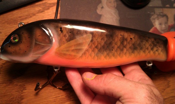 Heres a BCS made Jumbo pullbait. Over a pound in weight. You wanted a paint job pic. Heres a beauty! called "St. Clair sucker".