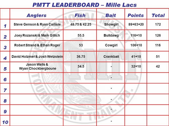Posts: 32951 Location: Rhinelander, Wisconsin | Day Two Video to view click on the links below. PMTT Mille Lacs Lake Day Two AM Interview With John Stevenson and Todd Cannaday https://www.youtube.com/watch?v=IZy_sTAveMg PMTT Mille Lacs Lake Day Two Am Interview With Jeff Blanck and Tom Rizzio https://www.youtube.com/watch?v=G5ibMHHuH1k&feature=youtu.be Jason Walls and Wyan Chockbergboune Take Fifth Place at The 2014 PMTT on Mille Lacs Lake https://www.youtube.com/watch?v=9PnqWcUoID8 David Holzmer and Josh Wetzstein Take Fourth Place at The 2014 PMTT on Mille Lacs Lake https://www.youtube.com/watch?v=jfzBNbd2RMY Robert Strand and Ethan Rogers Take Third Place at 2014 PMTT on Mille Lacs Lake https://www.youtube.com/watch?v=b8vdxANA_ms Joey Rozanski and Mark Gillich Take Second Place at The 2014 PMTT on Mille Lacs Lake https://www.youtube.com/watch?v=ytZ82c2Gf04&feature=youtu.be Steve Genson and Ryan Carlisle Take the Win at The 2014 PMTT on Mille Lacs https://www.youtube.com/watch?v=uYjLh7cTtzc&feature=youtu.be