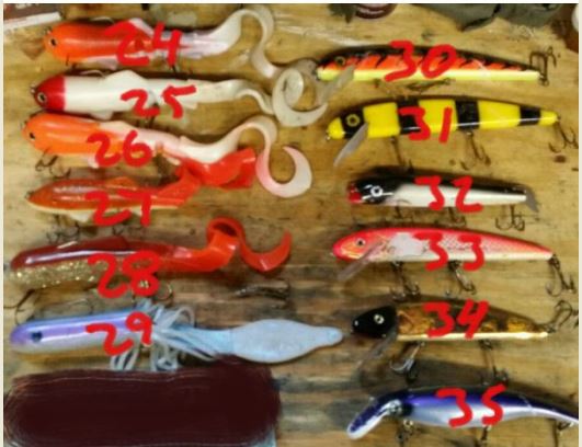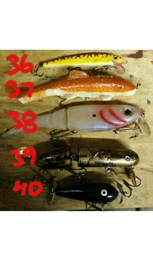 Posts: 43 Location: Roseau, MN | Cleaning out the collection. $6 shipping for one or all. Paypal preferred. Double 10’s 2. Gerry’s Girl $8 3. Figure 8 $8 Double 9’s 4. Gerry’s Girl $8 6. Northland $6 7. Gerry’s Girl (one treble) $7 8. – Llungen (one treble with re-tied skirt) $7 Misc Lures 13. Big Mama $12 16. 6” Reef Hawg $6 18. Homemade globe with spreader hooks $6 24. Mag Super D $6 26. Mag Super D $6 27. Curley Sue $6 29. Jimmy $5 30. 10” Jake $12 31. 10” Jake $12 33. 9” Grandma $12 34. 8” Jake $9 35. 10” Believer $12 36. 6" Grandma $5 37. Suzy Sucker $6 38. Kickn Minnow $6 41. Tiger Tube (I have 3 packs in this color) $4 42. Tiger TUbe $4 Edited by Flag Island Ron 9/26/2014 11:17 AM Attachments ---------------- Lures 1.JPG (84KB - 157 downloads) Lures 2.JPG (62KB - 172 downloads) Lures 3.JPG (53KB - 157 downloads) Lures 4.JPG (32KB - 163 downloads) Lures 5.JPG (48KB - 161 downloads) rps20140902_200813.jpg (100KB - 162 downloads) rps20140902_200850.jpg (130KB - 152 downloads) | ||