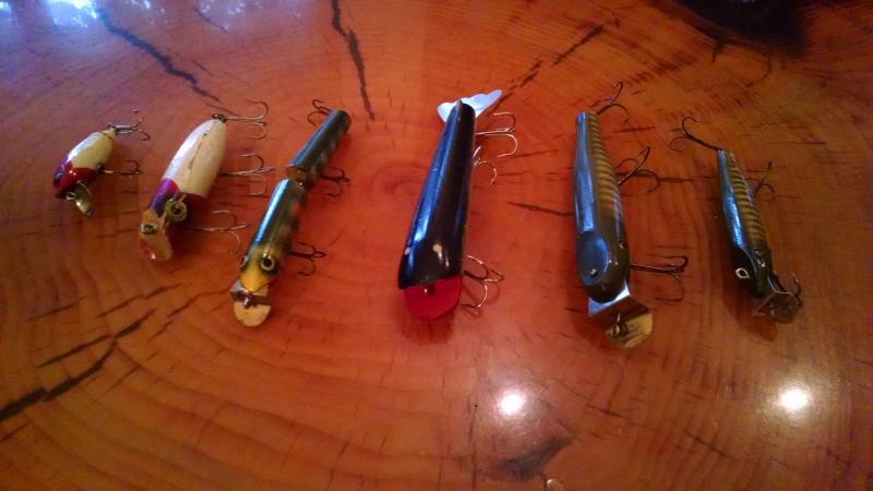 Posts: 1348 Location: Pewaukee, WI | The first two on the left look very much like West Bend lures made in West Bend Indiana. I can't remember the name of the first one, but the second one likes very much like a Bass O-Reno. The black one is perhaps a Bobbie Bait. | ||