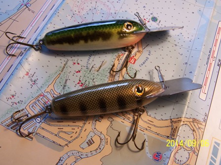 The large 10 inch walleye pattern I built it for a customer and this bait you can cast troll it just like any other crankbait like a Ernie or Depth Raider. I build this mostly for trolling it can easly reach 40 feet, the diving lip is 2 inches wide by 2.5 inches long. The other two are mostly for casting and both baits have a nice side to side swing, they hunt, this is typical of a Bomber Bait. The Bass Pattern has a coffing type lip and this one really swings from side to side about 2 feet, not by design, I just got lucky. The old Bomber baits were designed to look like a crawdad scurring backward. I got the idea when my brother was catching huge bass on Lake Geneva Wi. I figured why not make them bigger and use them for musky. You can still buy the bass size Bomber on E-Bay, its a great bait. The all action is in the the design of the lip and the attitude angle of the bait the way it sits in the waterl. Also if you noticed the two smaller baits I reversed the lip on the body mount, now looks normal, not backward. The way I fish these bombers is I like to crank down hit rocks or tops of weeds the let them pause and kind flot back up, or just a steady retrieve. The action on these baits is fantastic