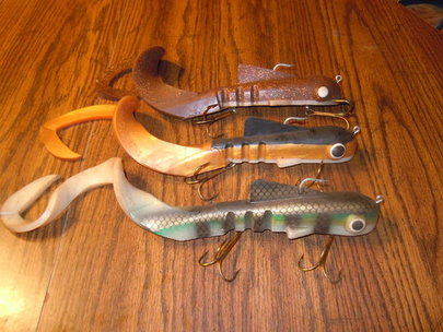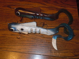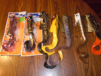 SOLD 3rd pic) Mag dawgs $12 apiece or $60 for lot (Walleye with white head, tri-colored walleye, and new dark baitfish SOLD)